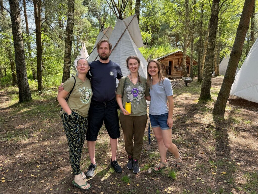 Co tu się wydarzyło, nie sposób tego opisać, zatem powiemy tylko krótko, że Adam poprowadził Praktykę Ponownego Połączenia wg Joanny Macy przełożoną na relację z Lasem, Aga ceremonię Zgromadzenia Wszystkich Istot, Kasia relacyjną, opartą na zmysłowym powitaniu z miejscem – osobą lasu – kąpiel leśną, a Darek Morsztyn Biegący Wilk po prostu pojawił się znikąd, jak genius loci miejsca, i opowiedział o czasach, kiedy ekologia głęboka wkraczałą do Polski, a on – po prostu tam był. Wspominał początki Pracownie na Rzecz Wszystkich Istot, przyjazd Arne Naessa, klimat tamtejszych czasów i to, jak przez ostatnie pięćdziesiąt lat myśl ta rozwijała się aż do dziś. Zwieńczeniem spotkania był bosy warsztat zaproponowany przez Agnieszkę, o którym za wiele nie da się napisać, bo jest on zdecydowanie do doświadczenia. I jest to doświadczenie raczej intensywne.